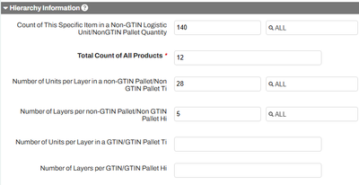 Please bear in mind though that changing the NonGTIN Ti and Hi will also affect the attribute called Count of This Specific Item in a Non-GTIN Logistic Unit/NonGTIN Pallet Quantity (the first one in your screenshot), as this needs to match the Ti multiplied by the Hi, otherwise the publications or updates will fail to sync with your retailers.