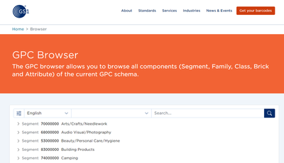 GS1 offers many tools to help information providers create, synchronize, and manage product content with trading partners. One of these tools is the GPC Browser you can use to browse all components (Segment, Family, Class, Brick, and Attribute) of ...