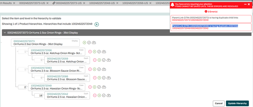 Once you have added your GTIN content, created your hierarchy, and validated successfully, it is important to publish at the appropriate GTIN level. Typically, you want to publish at the highest level GTIN that is appropriate for your trading partner. If you publish incorrectly, you may have to withdraw your publication and try again. This should also coincide with your Unit Indicators in IM for your hierarchy.