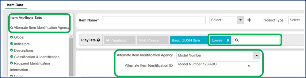 In Enhanced Item Management (EIM), make sure you activated the Lowe’s Playlist > search for the “Alternate Item Identification” attribute and select it in the search results > EIM will present these two attributes to you > In the Alternate Item Identification Agency attribute, choose one of the two Lowe’s accepted values, “Model Number” or “Assigned by Manufacturer.”