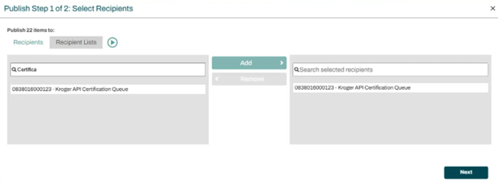 - Click “Publish” and enter the “Kroger API Certification Queue” GLN – 0838016000123