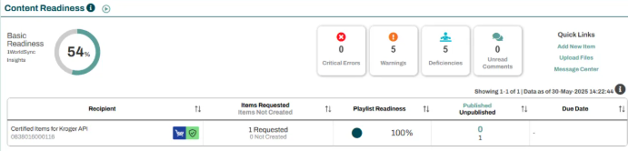 - Items passing the QA process and ready to publish to the Kroger API will be reflected in Content Readiness under “Certified Items for Kroger API” – GLN 0838016000116