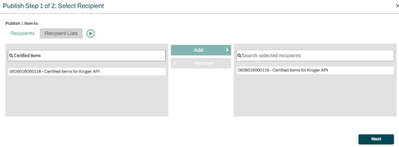 - Click “Publish” and enter the “Certified Items for Kroger API” GLN – 0838016000116